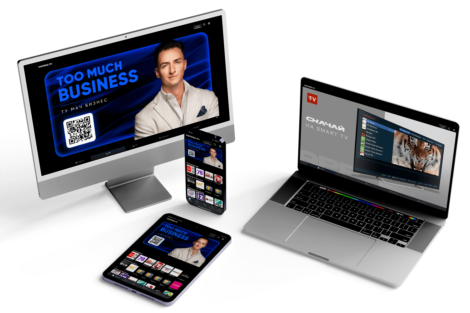 Сервис ViNTERA.TV работает практически на всех популярных устройствах: ТВ-приставках, Smart TV, Android TV, смартфонах и планшетах с iOS и Android, а также через любые веб-браузеры